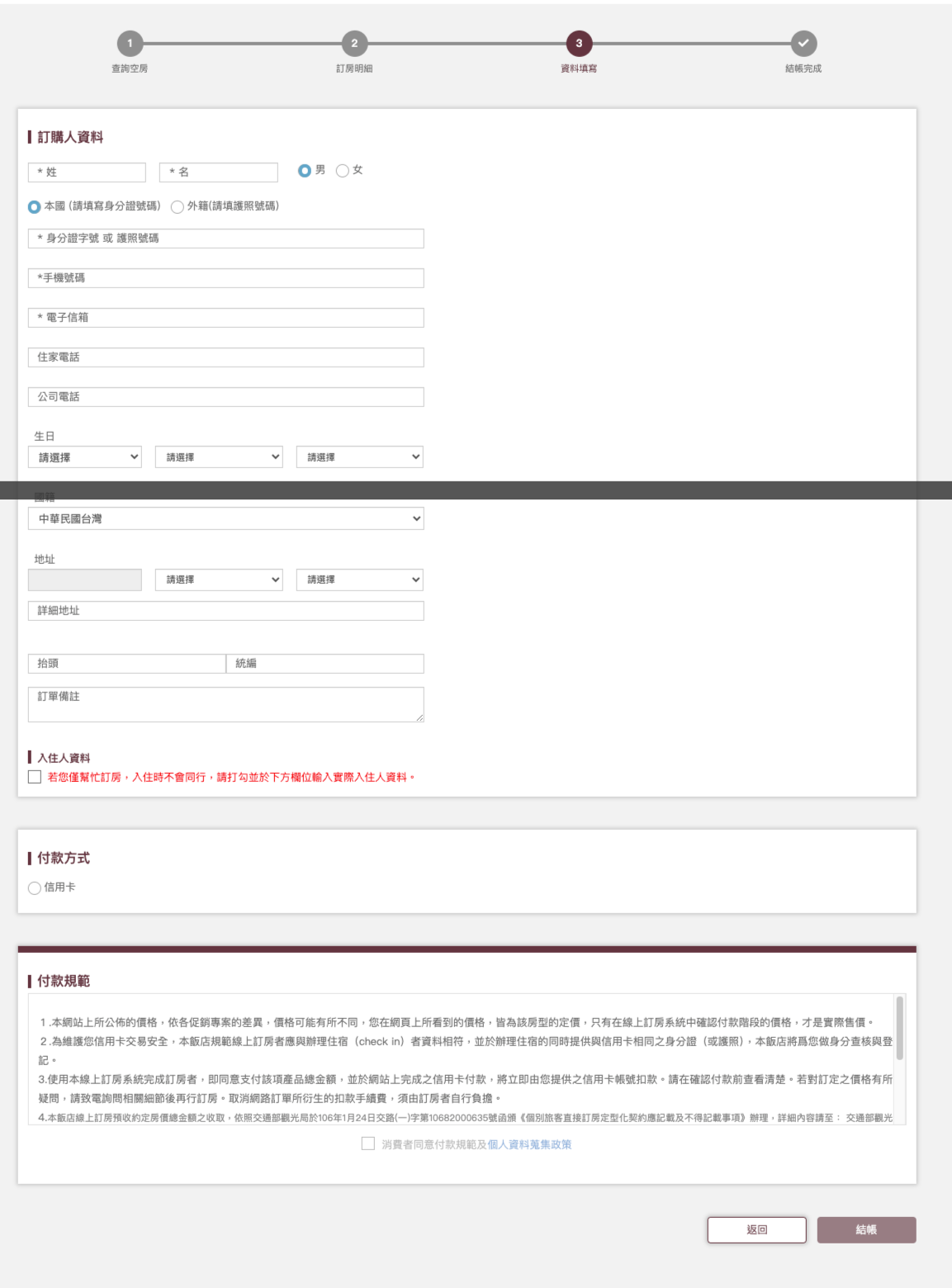 3.填寫入住資料&線上支付房價總額,可選擇信用卡支付。