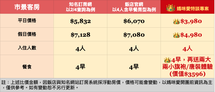 註:本次專案為「平日兩大兩小(未滿12歲)入住市景客房一泊一食」