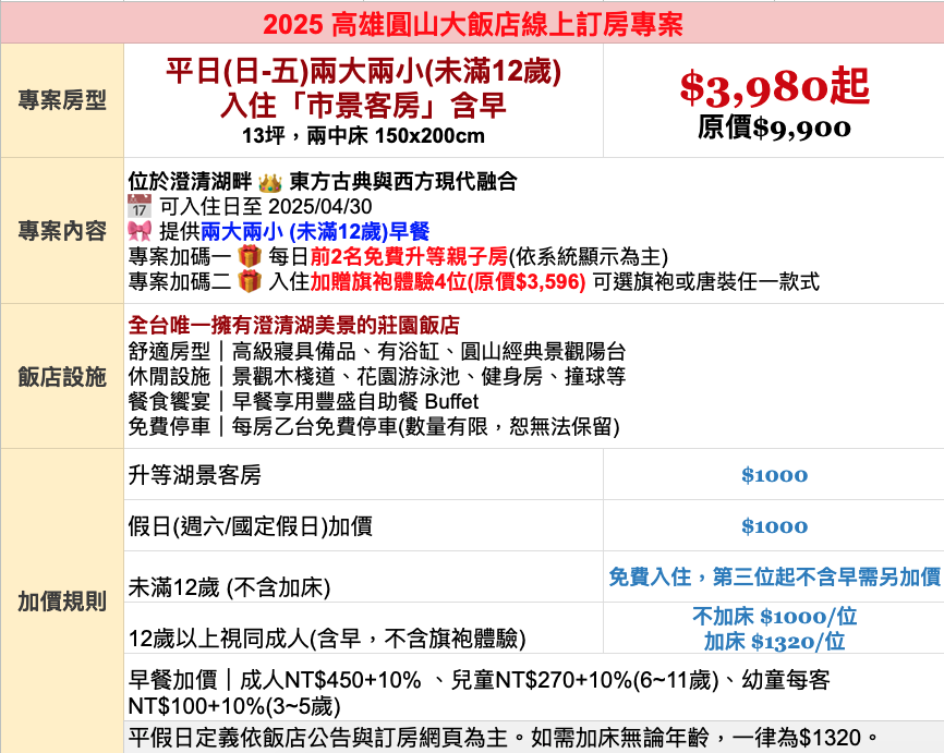註:加人加價:未滿12歲可免費入住,專案贈2位入住含早,第三位起不含早需另外加價(6-11歲$270+10%、3-5歲$100+10%)。12歲以上視同成人,每位加價$1000(含早、不含床&體驗)/加價$1320(含早&加折疊床、不含體驗) 每房至多可入住5位。