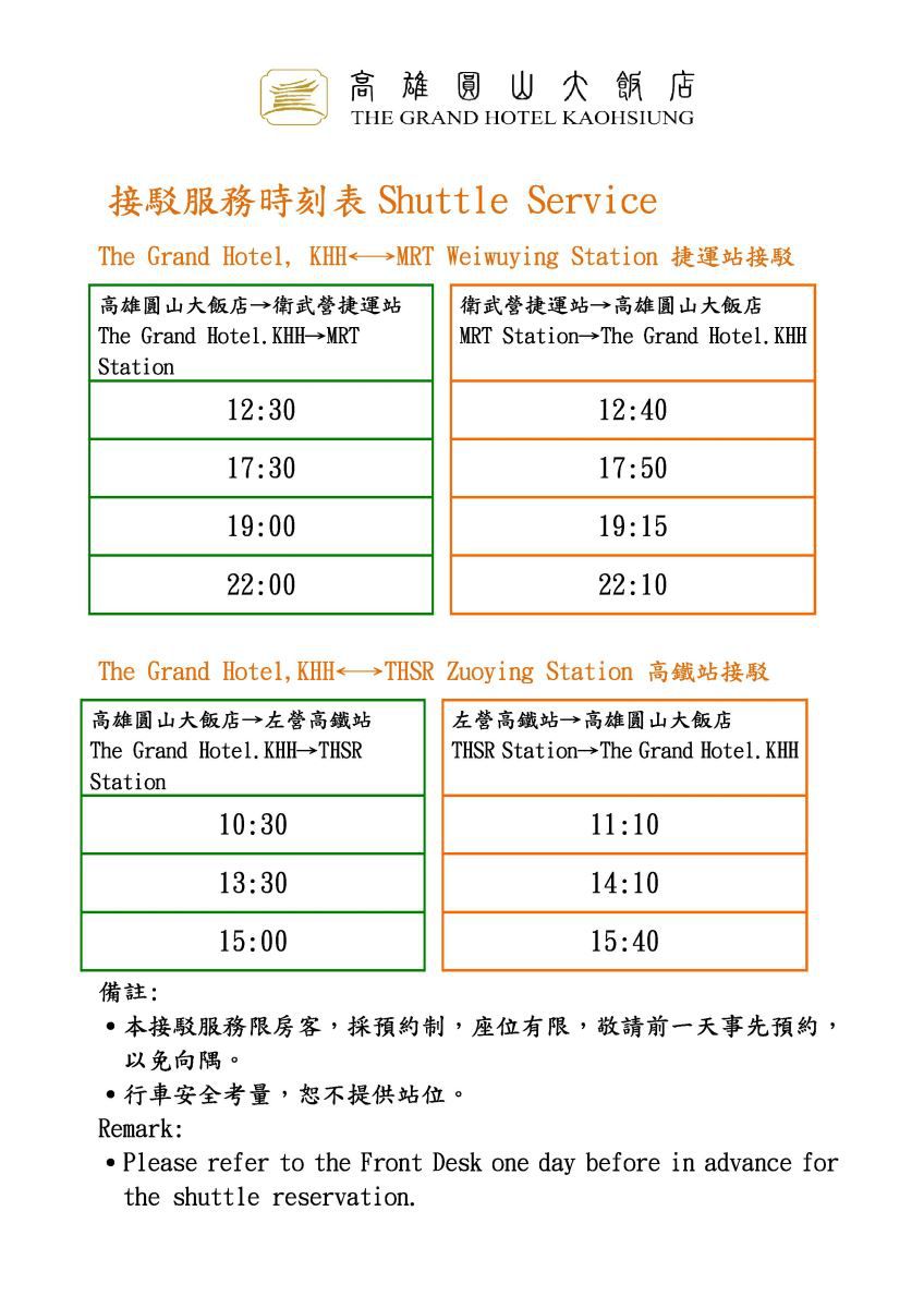 高雄圓山大飯店還提供了定時定點的飯店到「衛武營捷運站」、「左營高鐵站」接駁服務,有需要的爸比媽咪記得提前預約喔!另外也有新增提供「輕軌高工站C28」的接駁服務,詳情請洽飯店官網或櫃檯喔~
