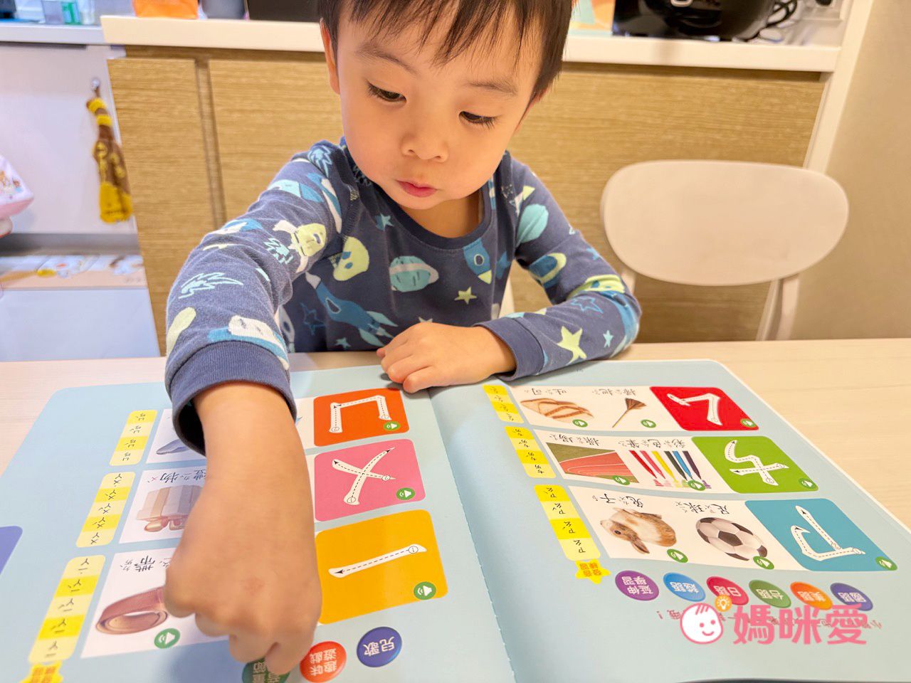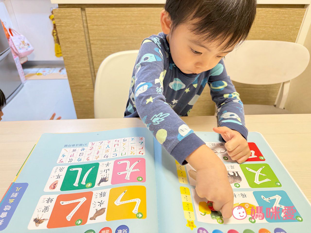遇到注音、字母主題時,姊姊都會帶著弟弟用手指練習一次筆順 (畫面很有愛🥰)