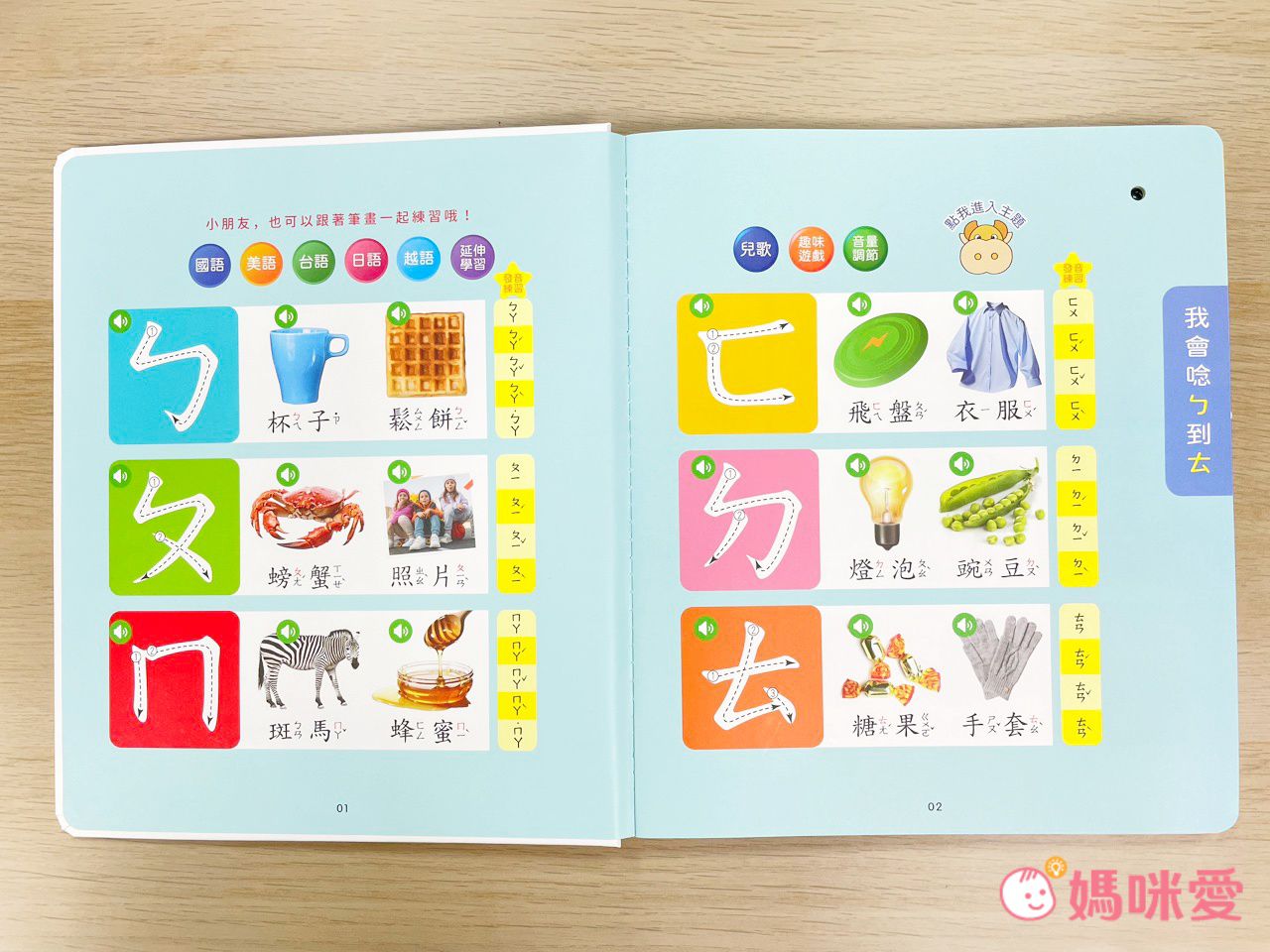 每個注音符號旁除了造詞也有發音練習,讓孩子及早熟悉聲調符號。