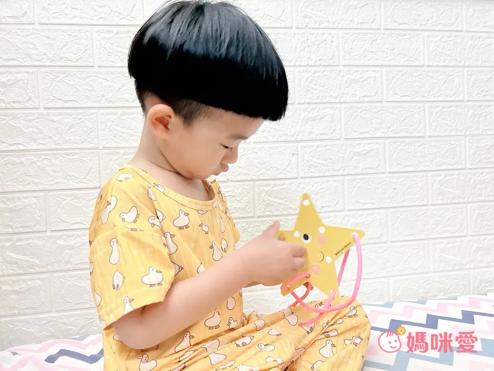 甚至能激發孩子創意和想像力,一條線和10個洞洞,能讓穿出多少不同點和線的組合呢?弟弟還串出一個提繩變成一個星星提包的樣子要送給媽媽😍
