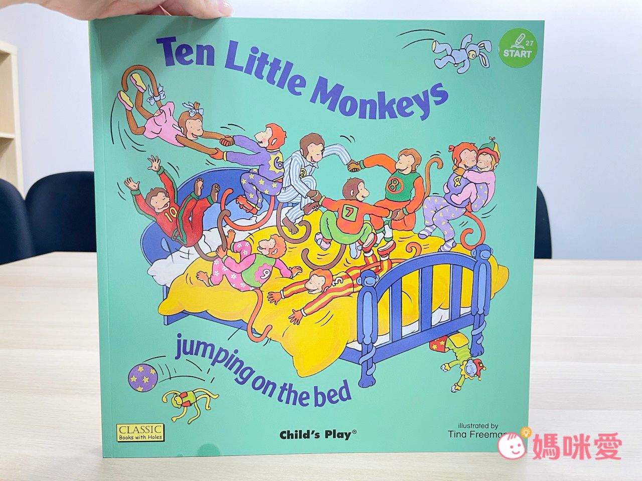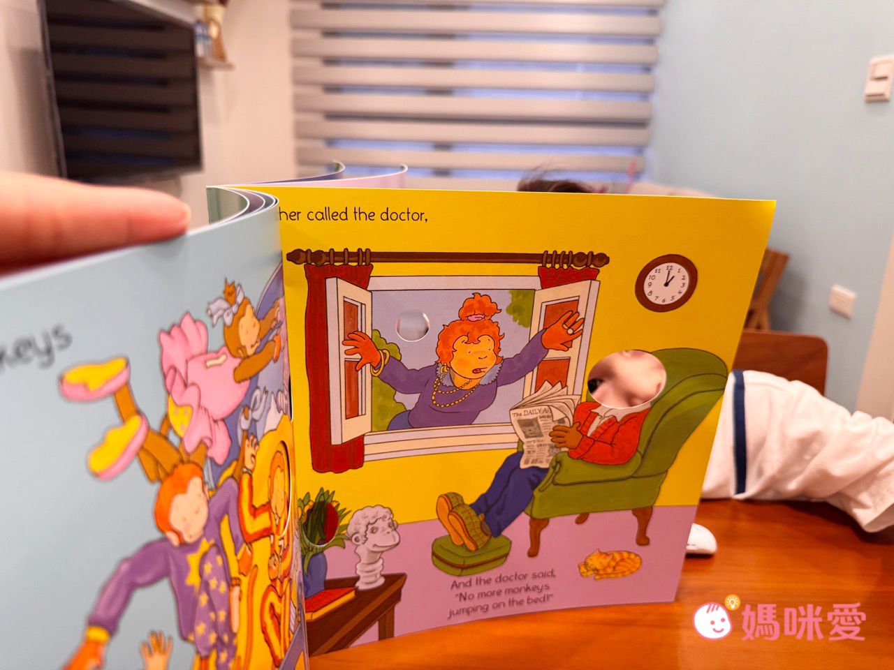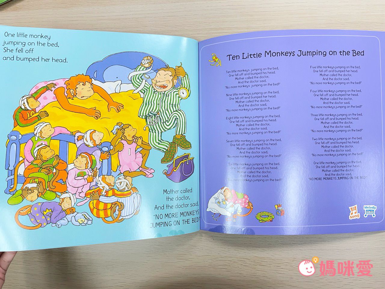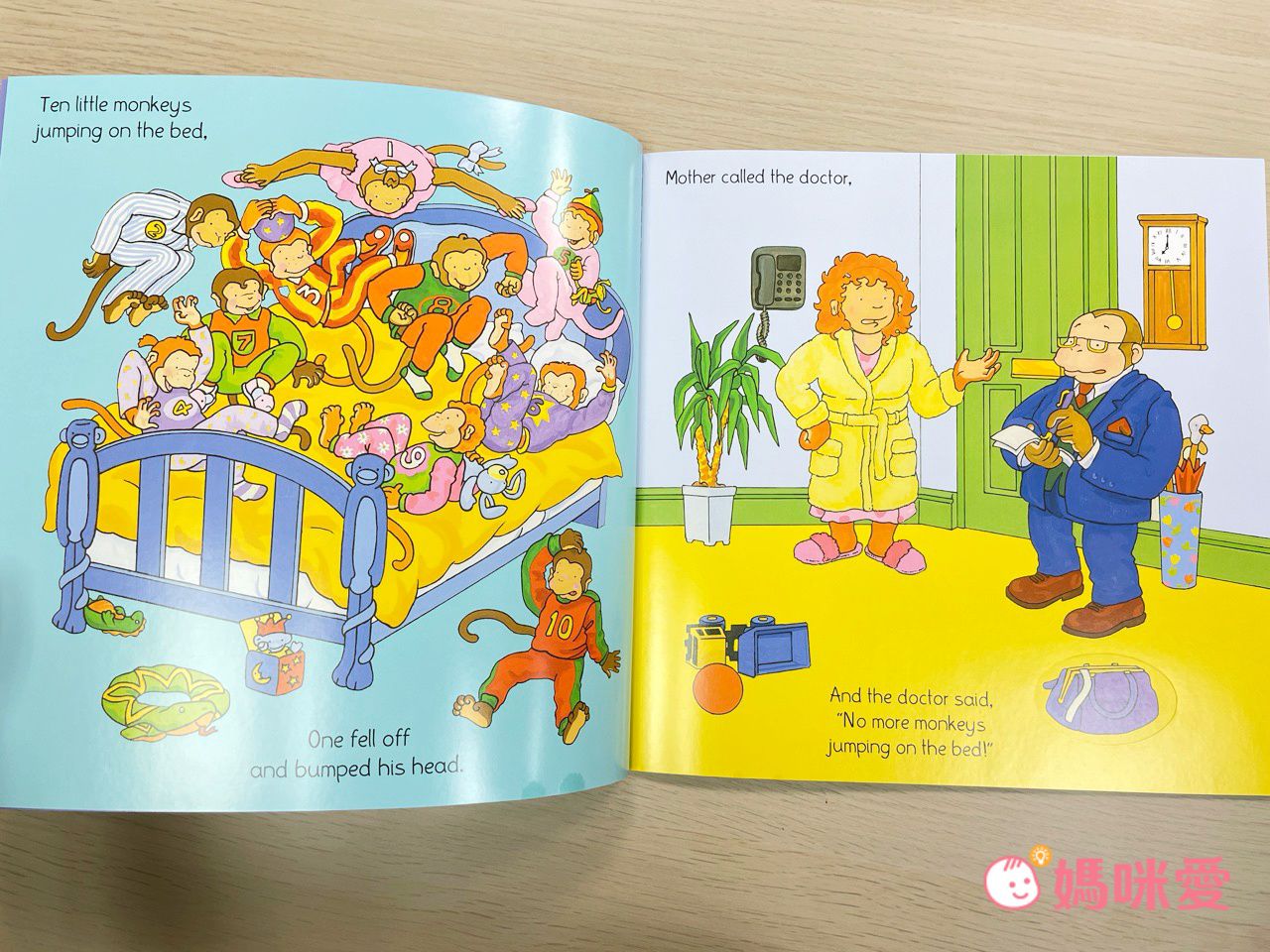 十隻小猴在床上亂跳,一隻接一隻掉下來撞傷頭,猴媽媽去找醫生求救,這本也很適合和數學概念結合。