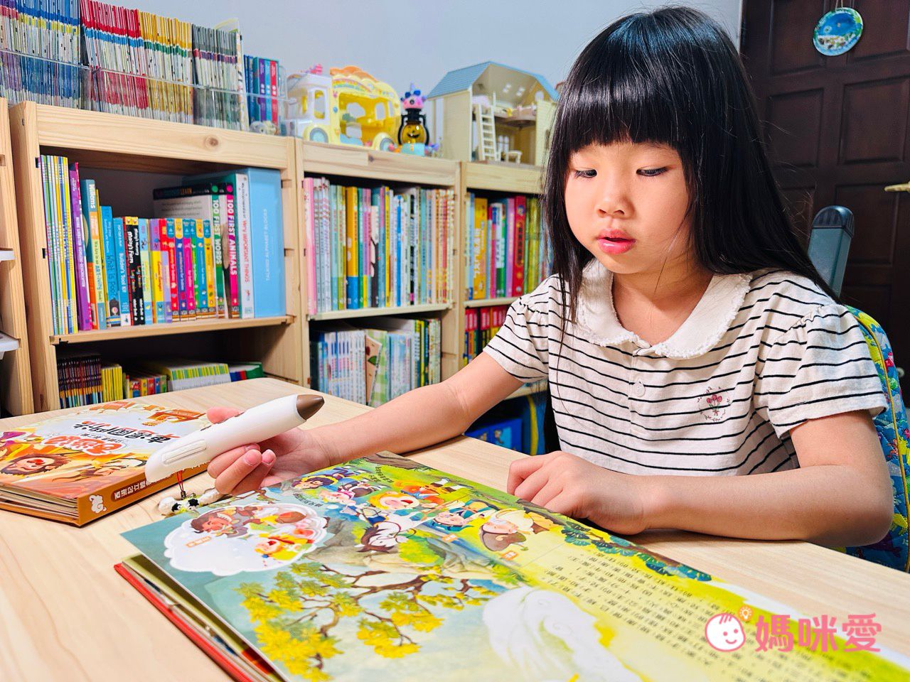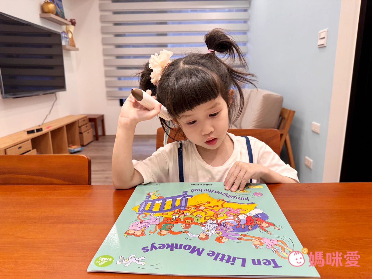 妹妹一邊用點讀筆聽音樂,一邊思考現在算到第幾隻了。
