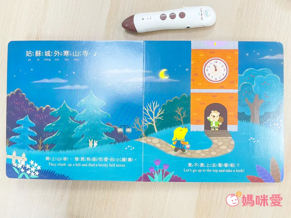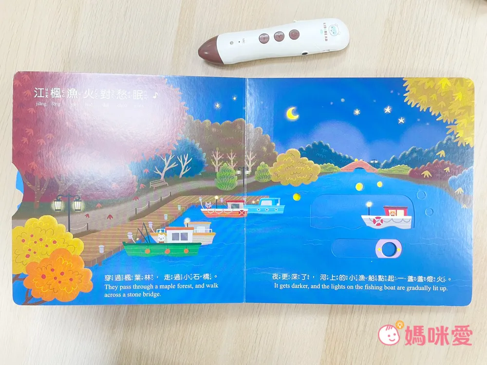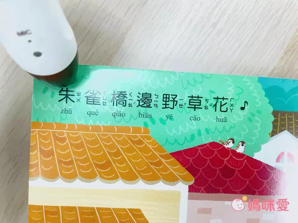 點讀筆點中文詩句會聽到該句子朗讀;點漢語拼音能分別聽到該文字的發音;點右邊音符則是聽到該句童謠。