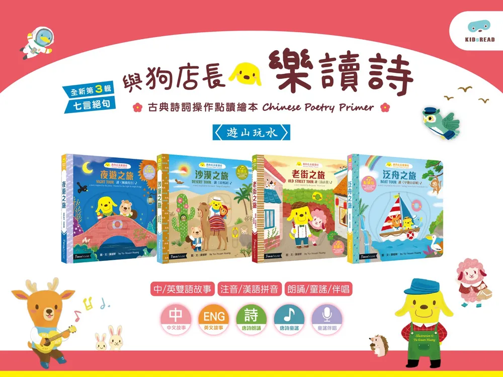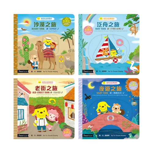 第三系列作品遊山玩水,選題為唐詩中的七言絕句,讓熟悉前兩系列的小讀者能進一步接觸新的唐詩體裁。分別有老街之旅 讀〈烏衣巷〉、泛舟之旅 讀〈早發白帝城〉、沙漠之旅 讀〈涼州詞〉、夜遊之旅 讀〈楓橋夜泊〉以旅遊為情境營造,引發孩子探索生活圈外世界的動機。