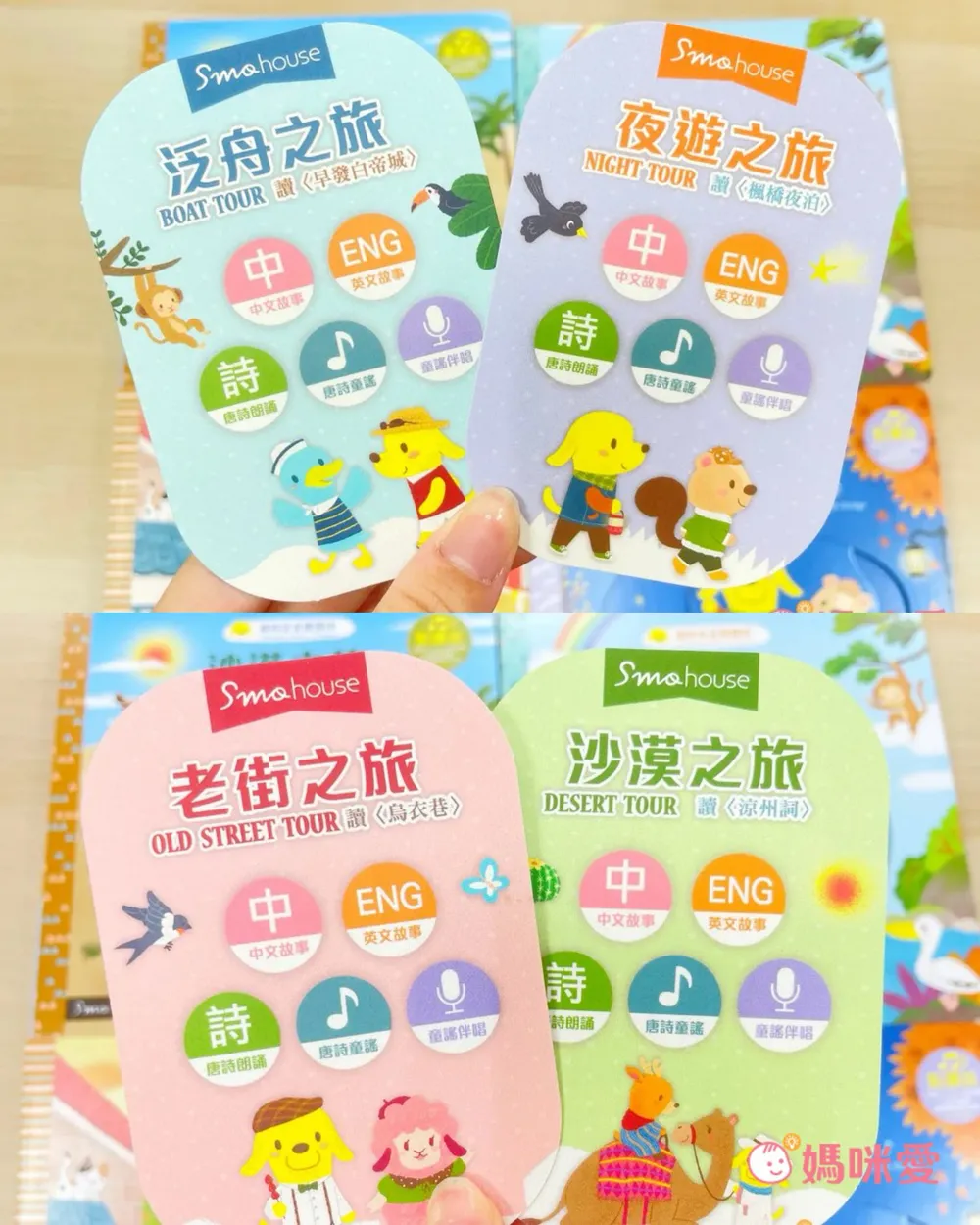 有時外出想聽歌不用帶書出門,2張點讀小卡就搞定:中文故事、英文故事、唐詩朗誦、唐詩童謠、童謠伴唱。