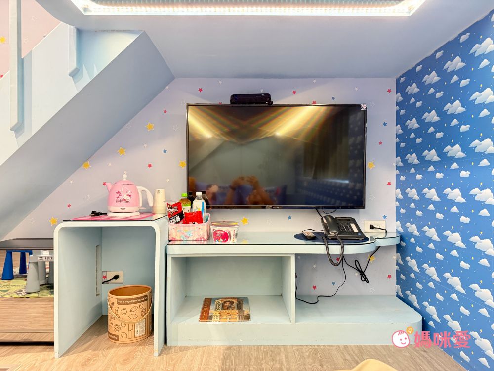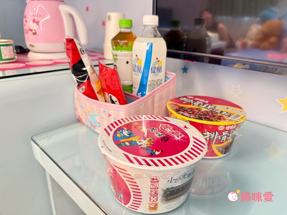 房間內有電視、冰箱、熱水爐及電話等配備,還貼心地備有泡麵、餅乾等小點心及瓶裝飲料