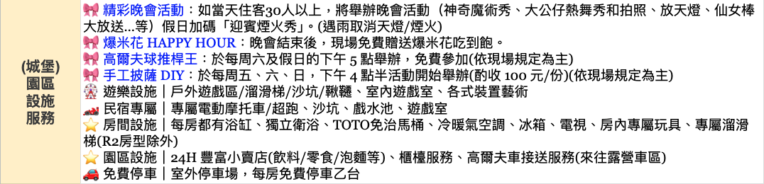 【詩情夢幻城堡】管家貼心地一項項介紹城堡內有哪些活動,超跑賽道、腳踏車租借、打卡換禮物及糖果夾夾樂都是入住成本專屬的!另外,露營車區的活動,住在城堡也能參加喲!因為露營車區的行程,要前往露營車區參加活動,除了自行驅車或借腳踏車前往外,城堡管家也能幫忙預定高爾夫球車雙邊接送喔~