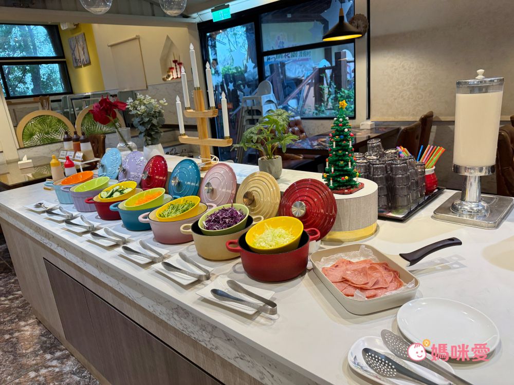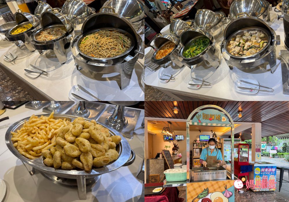 雖然不如直接房門口出來就能用餐方便,但選擇到露營區用餐的好處是選擇非常多樣,飲料自助吧有紅茶、柳橙汁、牛奶、奶茶、咖啡,不論是中式的稀飯、滷肉飯,還是西式的土司麵包都能任選。