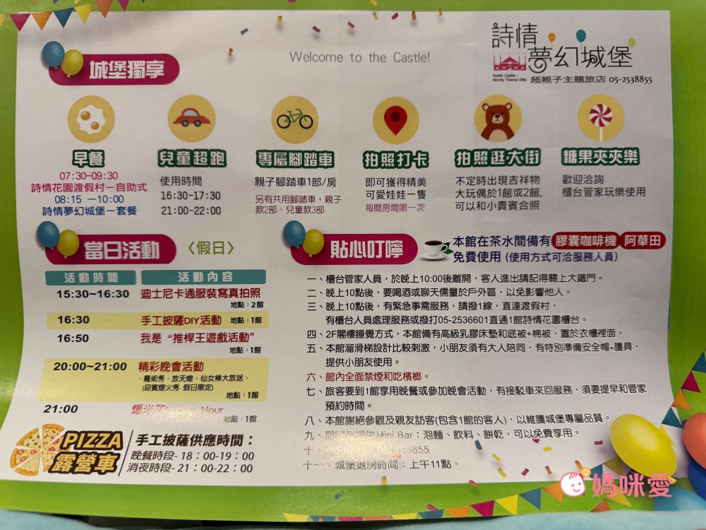 小提醒:城堡晚上10點後管家就會休息了~最外面的入口大門也會關上(但還是可以自己開門進出),室內遊戲區也要降低音量,但戶外區依然有開放,孩子若真的不累還是可以繼續放電放到睡的XD
