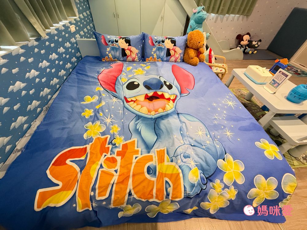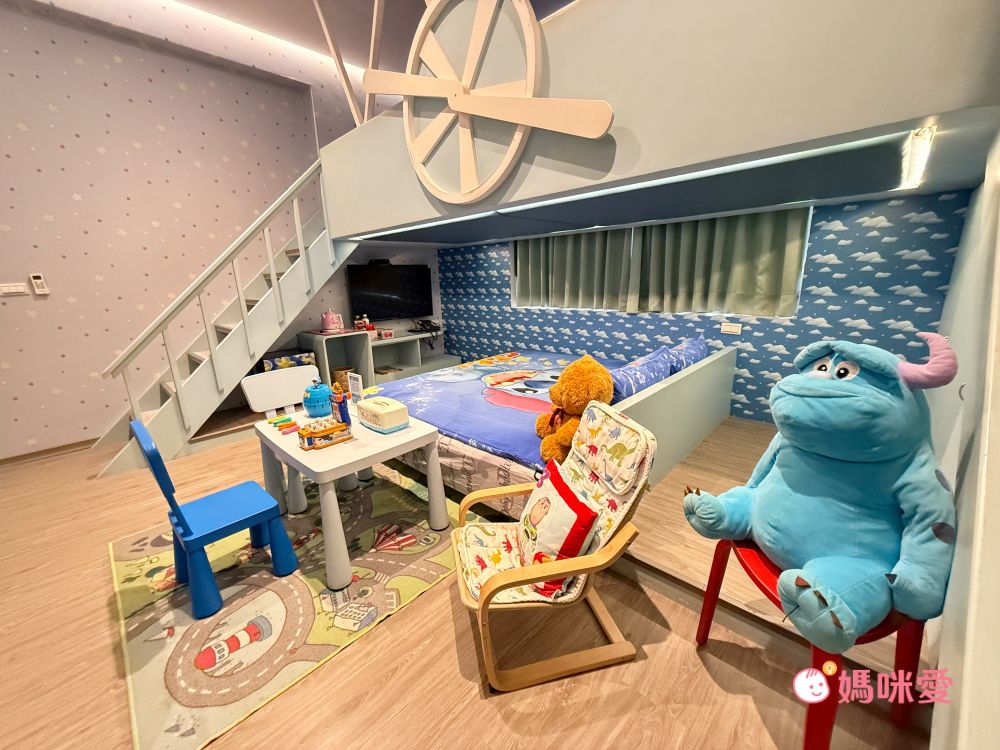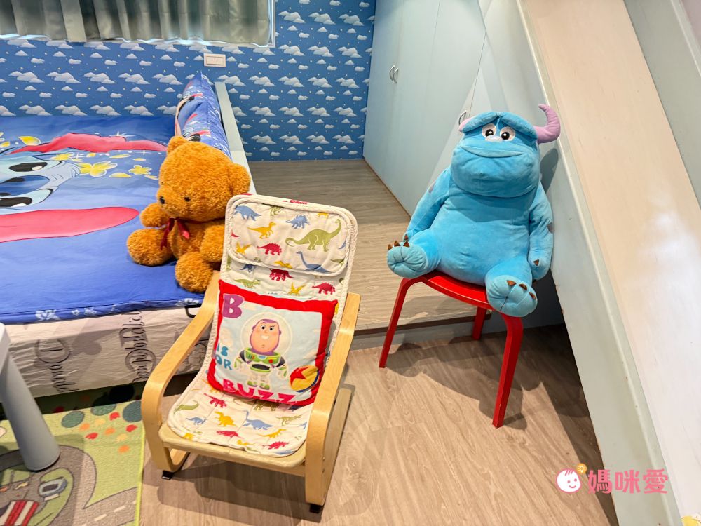 房中有許多迪士尼主題的小巧思,喜歡迪士尼的孩子一定會倍感親切,床鋪是可愛的星際寶貝-史迪奇,椅子的抱枕上是剛剛晳裝扮的巴斯光年,還有怪獸電力公司的薩利娃娃及經典的米奇娃娃,霂、晳像尋寶一樣找到各種迪士尼經典角色