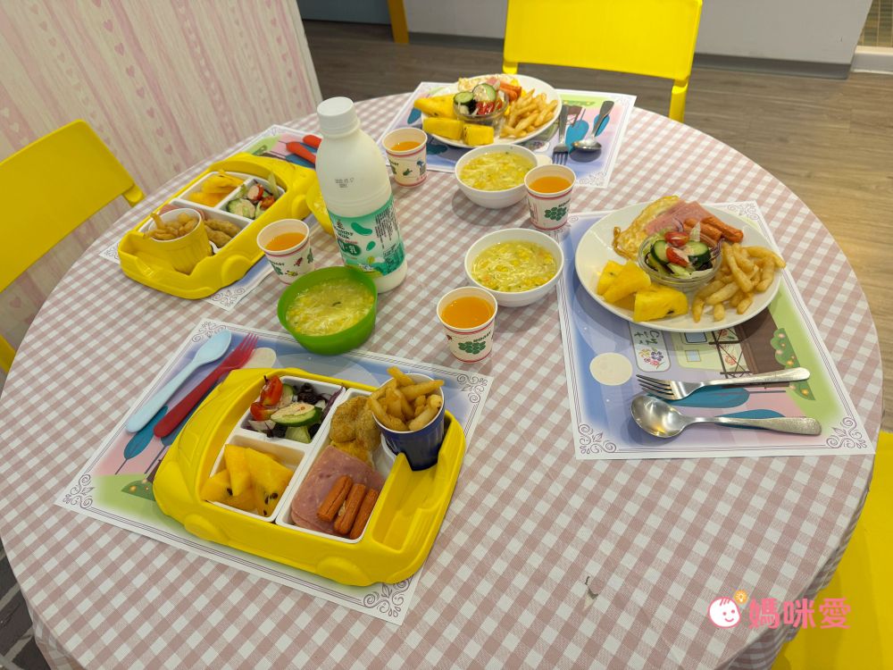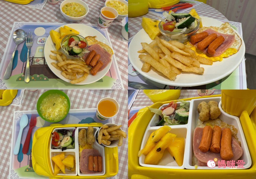 城堡內套餐有分大人餐及小孩餐,不過餐點內容物是相同的,前菜是生菜沙拉,主餐為火腿、熱狗、荷包蛋及炸物,還有玉米濃湯與餐後水果
