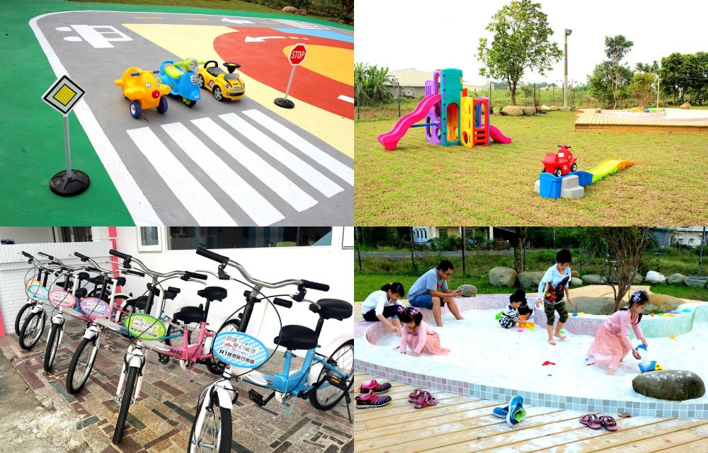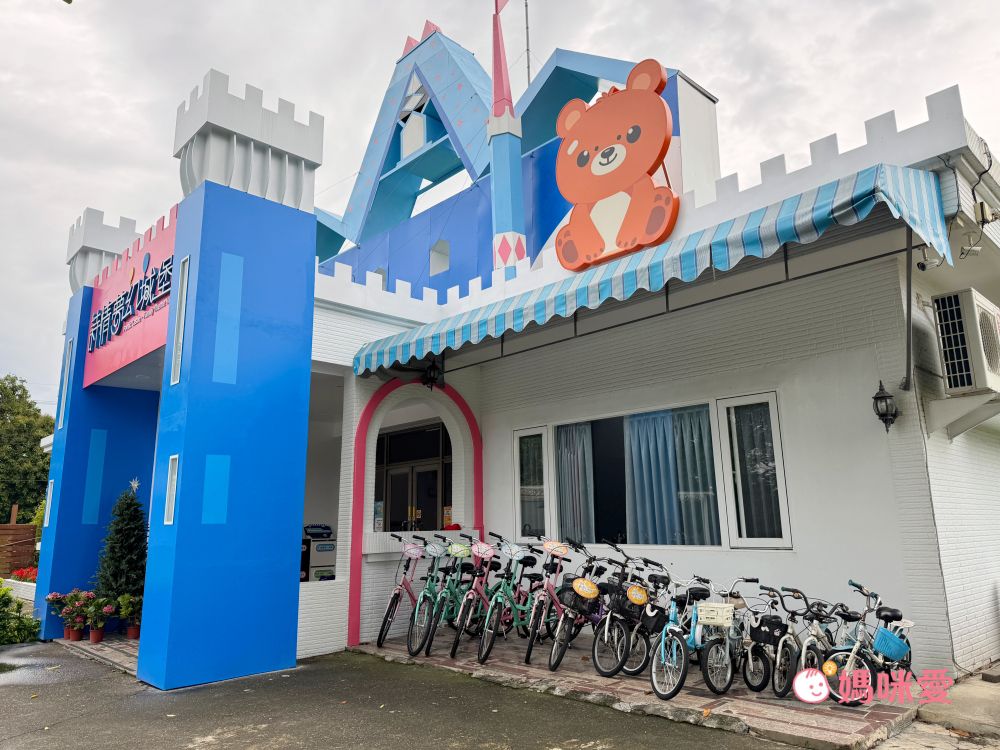 在城堡的外側,停放著許多腳踏車,每間房間都有專屬的腳踏車可借用,若不搭高爾夫球車,騎去露營車區也很便利,騎大概5分鐘左右就能抵達。雖然霂很想借用兒童腳踏車,可惜天公不作美,天還亮著的時候總是下著雨,最後只能惋惜作罷,若家裡有會騎車的大孩子,推薦可以全家借腳踏車在附近騎鐵馬兜兜風,享受阿里山下的微風所帶來的清新空氣