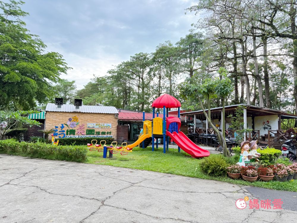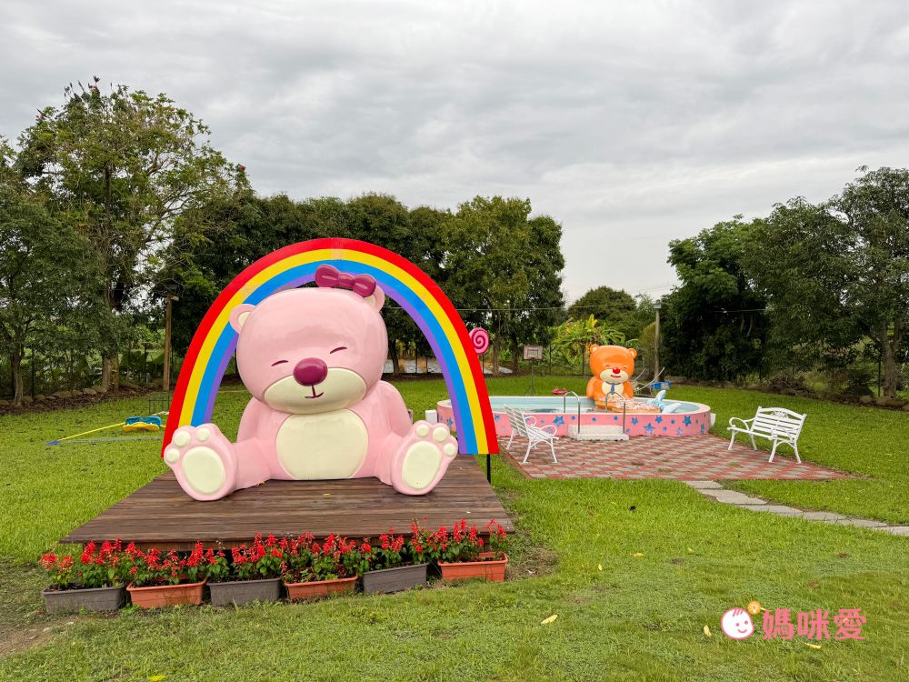 在賽車場前的大草皮,有詩情花園渡假村的吉祥物-管家熊坐在平台上,由於體驗的這兩日一直雨勢不斷,沒使用到戶外遊具,若天氣晴朗時前往,可向管家借用足球、球拍等,在大草皮上盡情跑跑跳跳