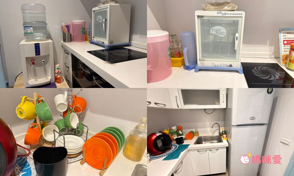 【詩情夢幻城堡】內有設置茶水間,有冷熱飲水機及奶瓶消毒機,帶年紀較小的幼寶前往也沒有問題!也有電磁爐可供加熱,雖然房間有冰箱但不大,因此茶水間的冰箱也可以使用,由於一泊二食的關係,下午霂、晳於DIY時間製作的PIZZA烤好之後,全家都已吃晚餐,因此回程後就將PIZZA冰箱,隔天退房直接帶回家,也很方便喔!