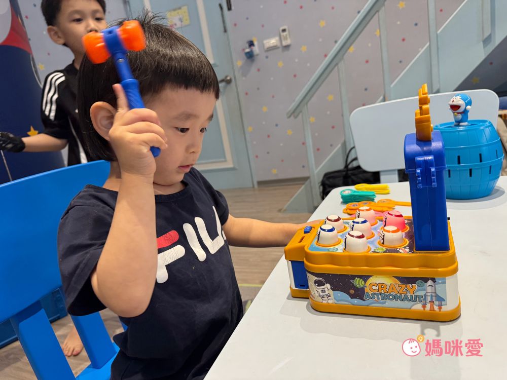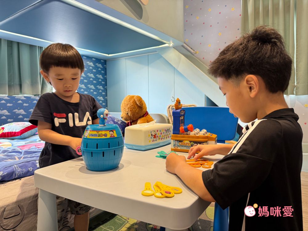 溜滑梯累了,想靜下來休息時也能到遊戲桌玩遊戲,經典的海盜桶及打地鼠也成功擄獲了霂、晳的玩心,兩人比賽海盜桶誰能堅持到最後,而打地鼠又是誰最高分呢?