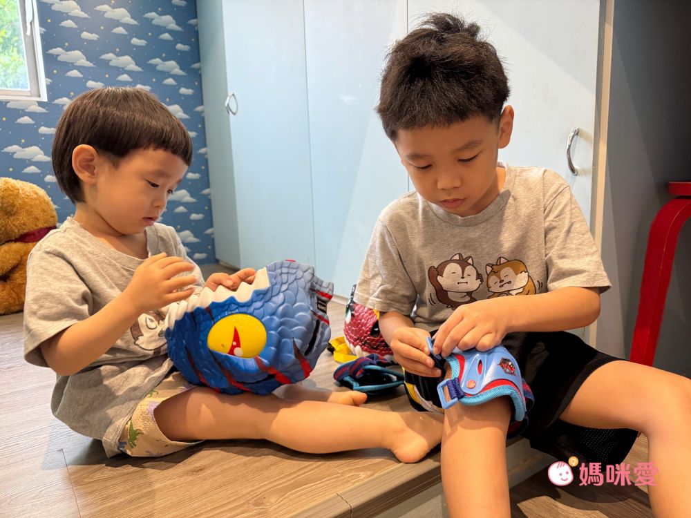 上層溜滑梯的一隅,貼心地準備兩組專門給孩子使用的護具,如果覺得溜滑梯太陡會害怕,可以先戴上護具,玩得開心又安心,爸媽也可以放心地在旁休息