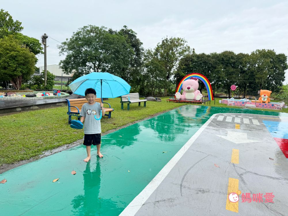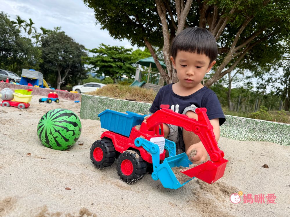 當然~孩子樂園絕對有小孩最愛的大沙坑啦!沙坑內擺滿了玩沙工具,還有大大小小的挖土機,即使下雨也完全不減晳的玩心,要離開前還請霂幫他撐傘.依依不捨地說再玩一下下