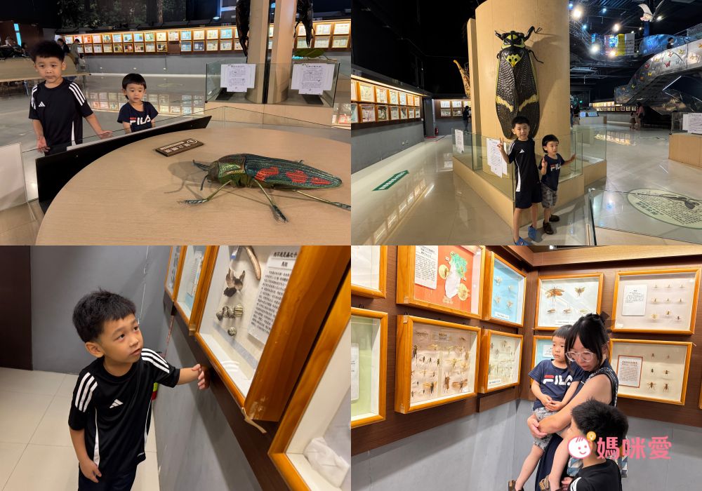 嘉大昆蟲館館內共分為保育類昆蟲模型、彩蝶柱、國內/外昆蟲標本展示區、雨林生態區、溫室花園、昆蟲體驗區等。一進到館內就看到許多按照原比例放大的各種昆蟲,可以仔細觀察細節,解說牌也有詳細的介紹。昆蟲館一樓最大的特色就是豐富的標本,有蝴蝶類、蜻蜓類、蟬類、蛾類、竹節蟲類、蜘蛛類,還有…蜚蠊類(蟑螂XD)…,透過解說牌和孩子說明,可以一起學到了很多昆蟲小知識!