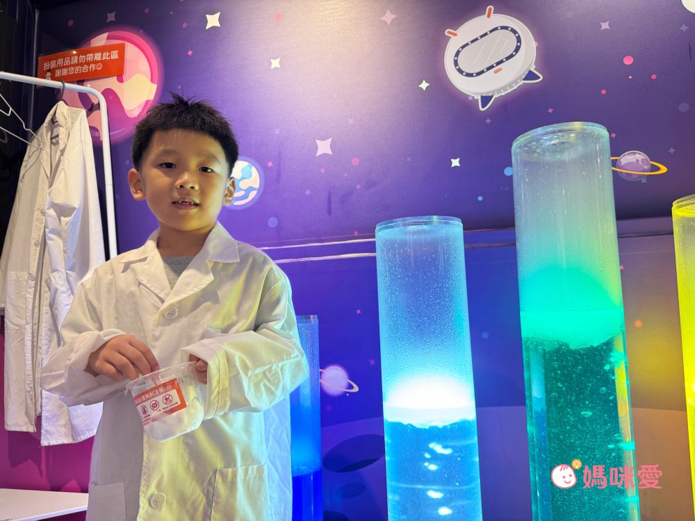 步入生產製程走道,各種氣泡水機零件組成的「酷武士」,帶孩子走進氣泡水機的製程故事,最後抵達冷研探索館裡最美的網美拍攝區,可以穿上實驗袍,將乾冰倒入桶柱裡面,製作出夢幻泡泡拍攝照片