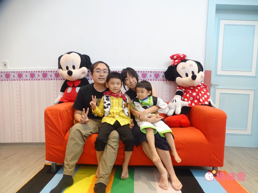 在進房前,管家會協助孩子們挑選可愛的迪士尼衣服,從華麗的公主裝到帥氣的英雄裝,架上應有盡有!霂、晳穿的是玩具總動員裡的胡迪及巴斯光年,管家直接拿出小配件點綴衣服,連細節也不馬虎~拍攝全家福外,管家也會幫孩子拍個人照喔!所有的照片管家都會將檔案寄至信箱,而全家福的部分會洗出來,第二天早上時裝框送給我們:D