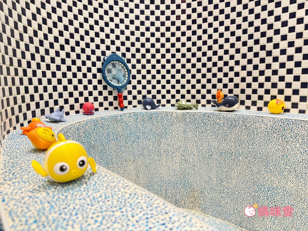 浴室內有個超大浴缸,霂、晳兩人一起泡造,空間依然綽綽有餘,浴缸周圍擺滿了洗澡玩具,放好水後可以在浴缸內撈魚和噴水,浴室宛如水樂園