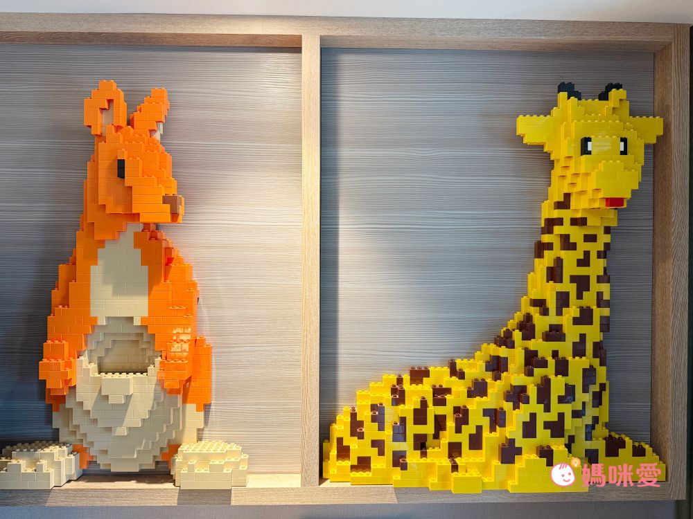 出電梯就看到繽紛的積木牆,客房以諾亞方舟故事為靈感,發揮創意、運用萬片積木拼湊出各種動物。
