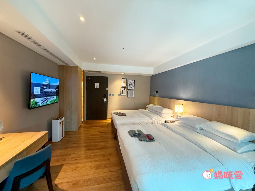 高級家庭客房,一走進房間就被那種靜謐又放鬆的氛圍吸引。整體空間以低調沉穩的用色搭配木地板與床頭設計,營造出日系簡約風格,讓人一進房就有放慢腳步的感覺。