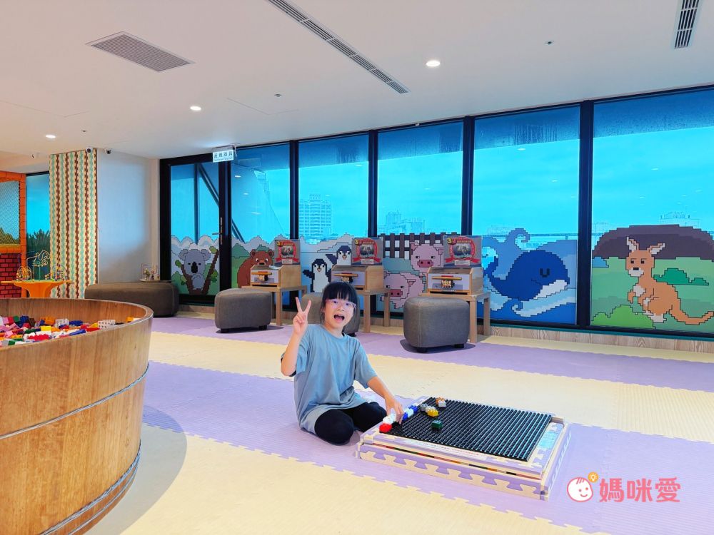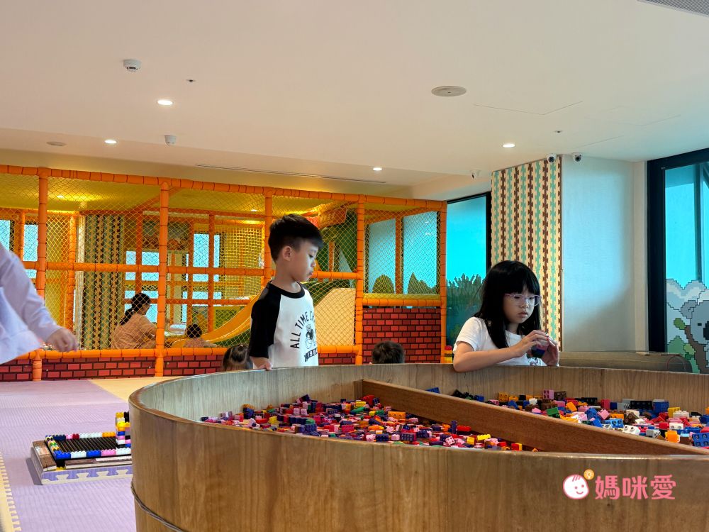 酒店內設有積木主題的親子遊戲室,裡面有積木球池搭配溜滑梯組合,還有彈珠檯、積木溫泉區,讓孩子們玩得超開心,大人也能放鬆一下!