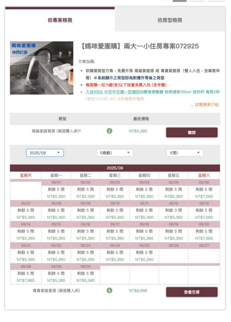 1. 點擊專案訂房連結(點我)選擇欲入住的房型、點擊「查看空房」,如不可訂房/已客滿將不顯示,請選擇其他天。