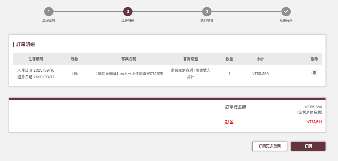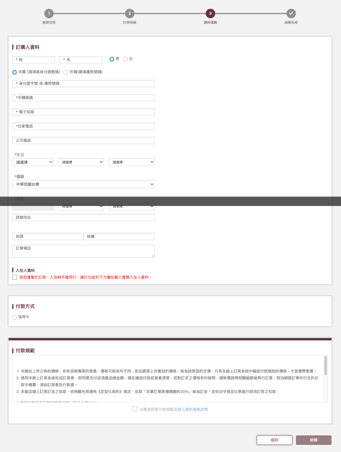 2. 確認訂房資訊、將收取30%訂金作為保留。