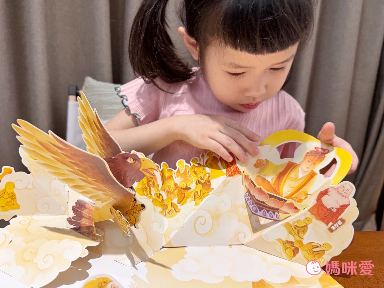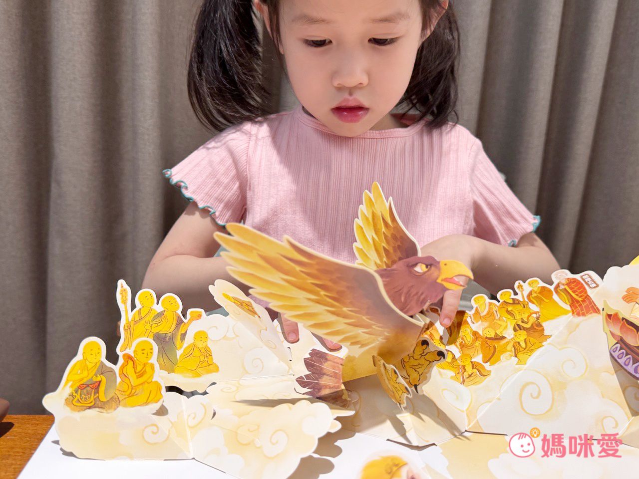 場景堆疊再加上被綁住的唐僧晃呀晃,芙咪翻到這頁時,很認真動動小手玩玩機關,融入劇情一起扮演角色。