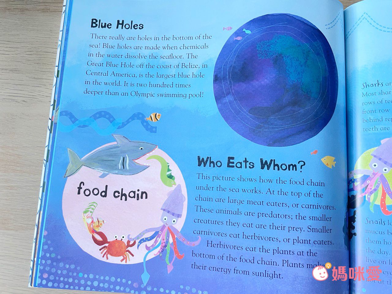 生動的把海洋動物放進海裡的大黑洞裡,每一頁都可以認識新的海洋動物呢!