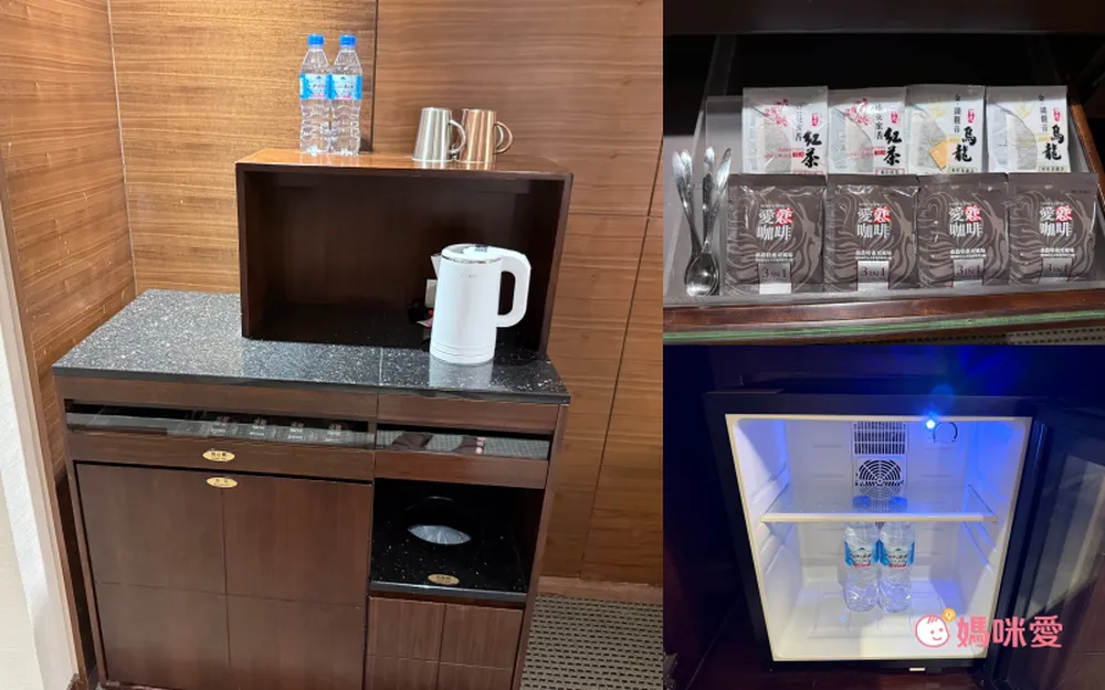 除了這幾大亮點,房間內備品部分也是不馬乎~房內有附上茶包與茶杯、礦泉水,也有熱水壺喔~