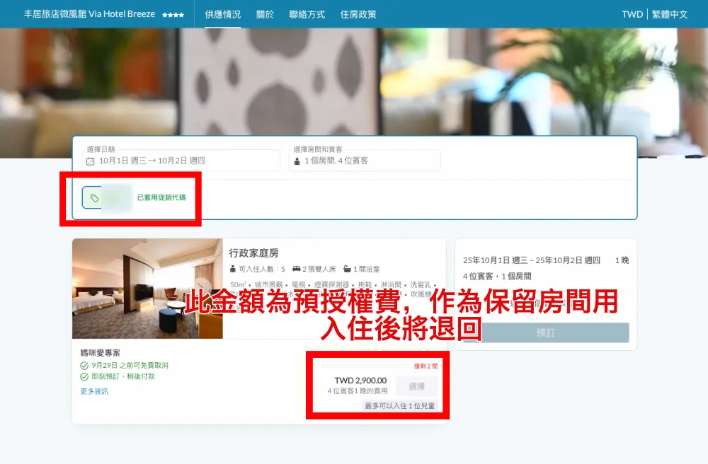 2. 輸入日期、人數後,點擊「有促銷代碼嗎?」並輸入票券上所示專屬代碼。顯示之房費為「預刷授權金」,將作為保留房間用,後續住房時出示票券將退回。