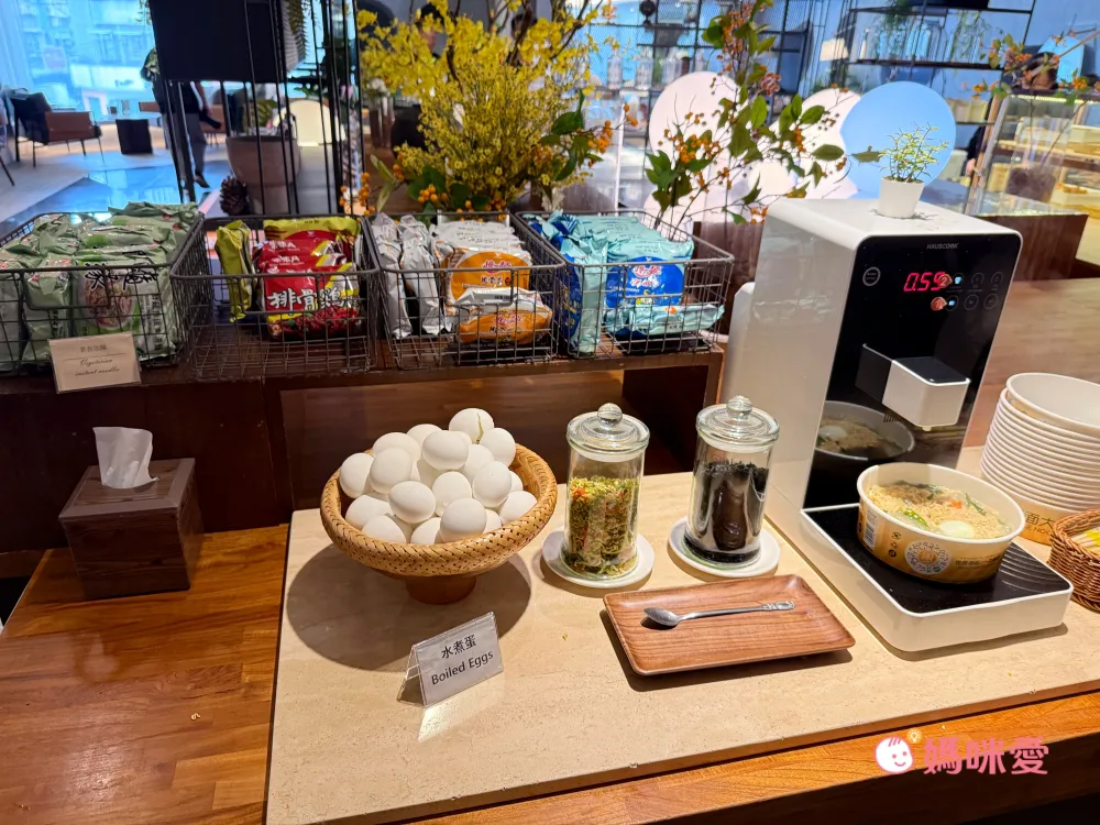 特別的是有煮泡麵的機器,加水之後可以設定時間讓它煮沸,還很貼心的提供水煮蛋、乾燥蔬菜,以及海帶芽,吃起來比較沒有罪惡感!(泡麵供應時段07:30-10:00、22:00-00:00)