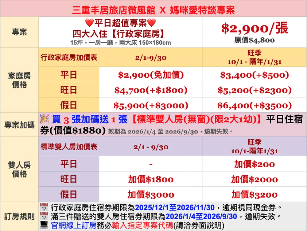 【正券】行政家庭房,可入住日期:2025/12/1 至 2026/11/30,逾期視同現金券。