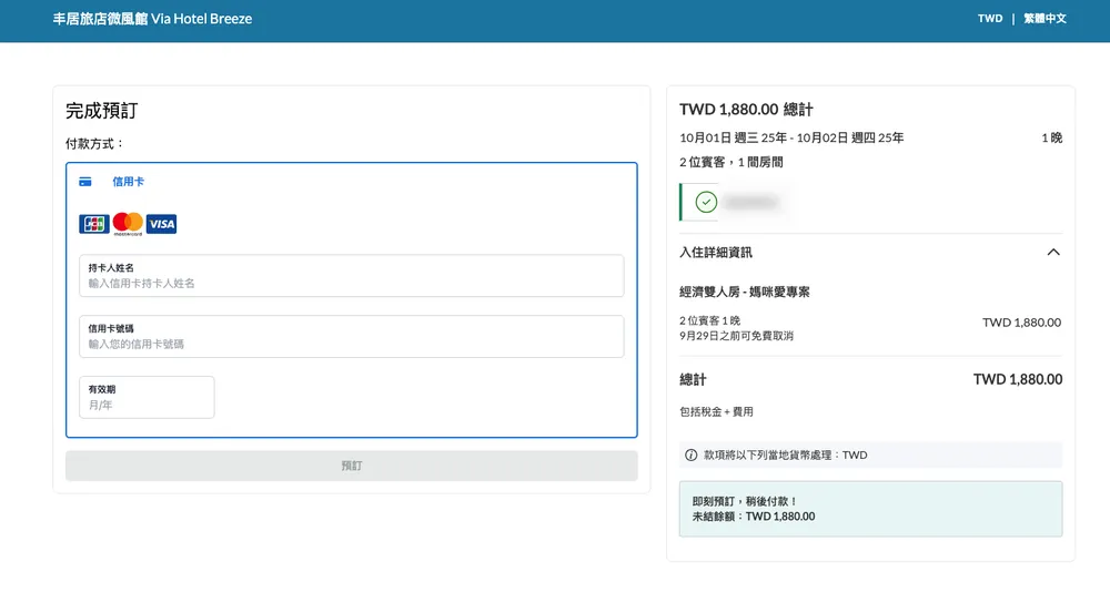 本團提供實體住宿券,收到票券後,請至官網訂房:https://viabreeze.hexa.tw/event/1934進行訂房,輸入本券專屬折扣碼(請洽券面說明)及信用卡卡號進行全額預授權(僅作為保留用)。如信用卡預授權失敗,飯店將主動連繫客人更換其他信用卡,如逾時24小時未能提供有效信用卡,飯店得取消此筆訂單且不再另行通知