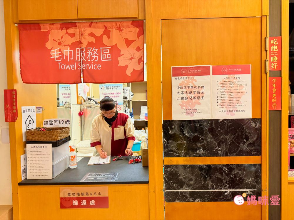 主打泡湯的日光溫泉會館,在進入室內湯屋及泳池SPA區之前,可以在毛巾服務區借用毛巾及置物櫃的鑰匙後,再帶入SPA區,不用從房間自己攜帶,非常的方便!