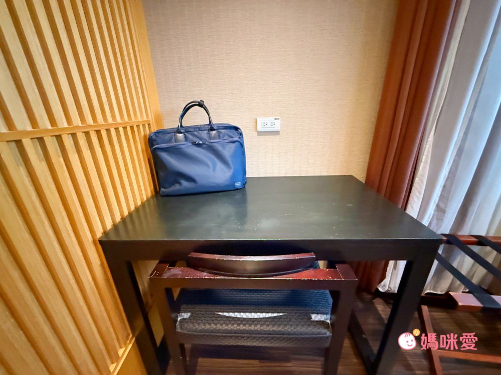 沙發區旁邊也配置了書桌,外出臨時要辦公也很方便,有專用的插座可以讓筆電充電。