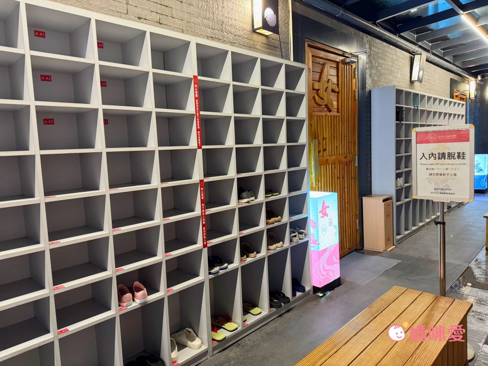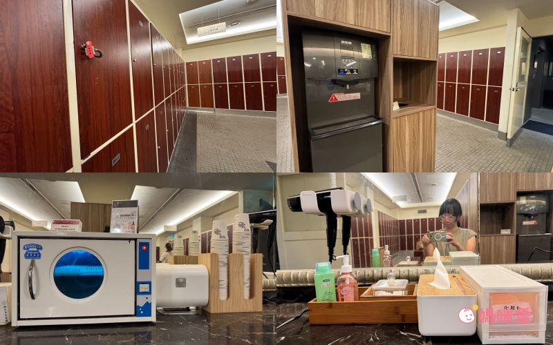 入內後按照毛巾服務區給的鑰匙號碼尋找置物櫃,置物櫃區的內側有飲水機、已消毒的梳子以及梳妝台,梳妝台上也有提供化妝水、乳液、化妝棉等用品,讓女性來這時不用帶瓶瓶罐罐,直接前往就可以順利泡湯