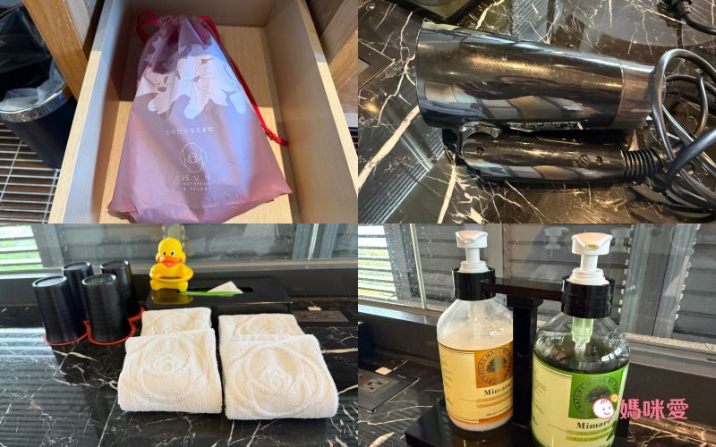 浴室抽屜內提供了吹風機,不是按壓式的吹風機,可以坐著好好吹頭享受戶外風景,妝台上有提供的漱口杯、溫度計小鴨、洗手乳、乳液、擦手巾、浴巾與毛巾等。