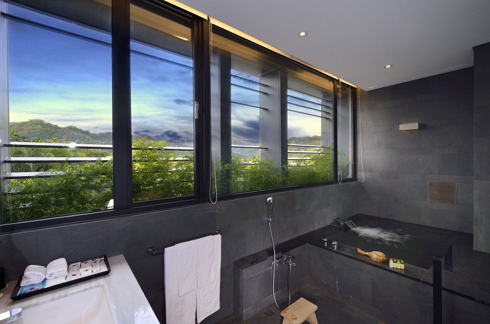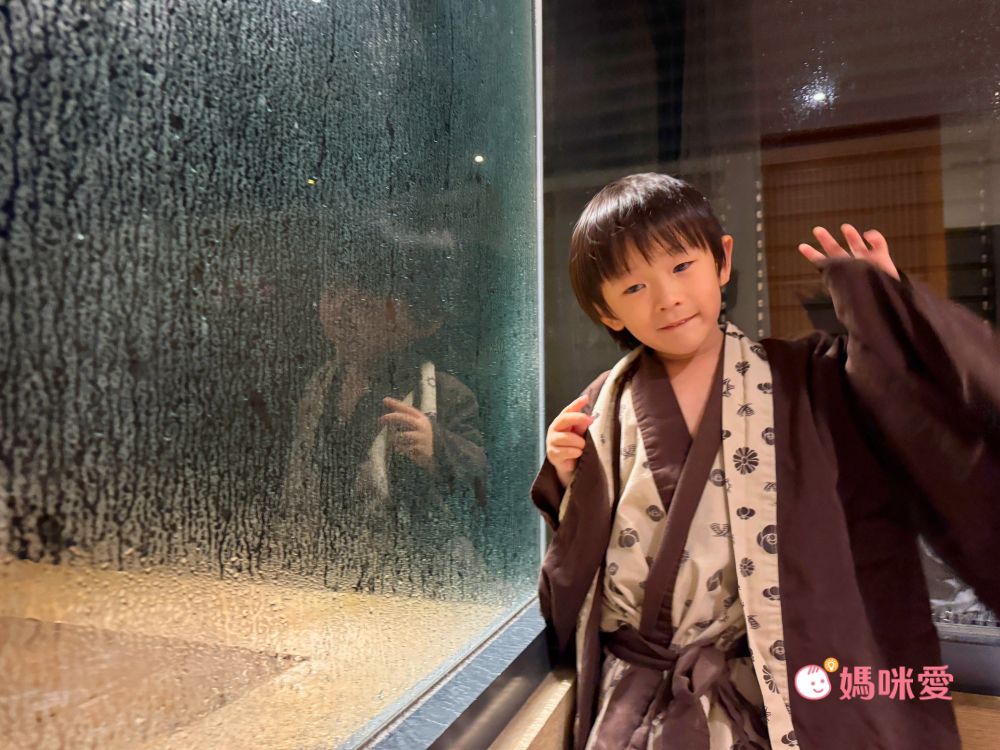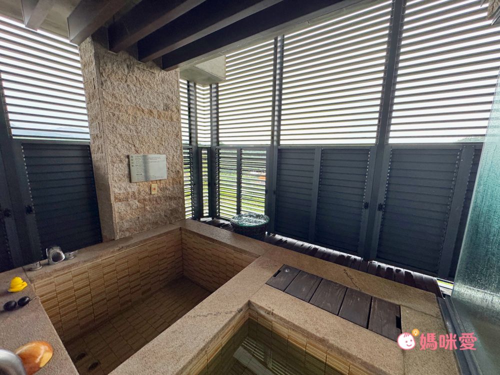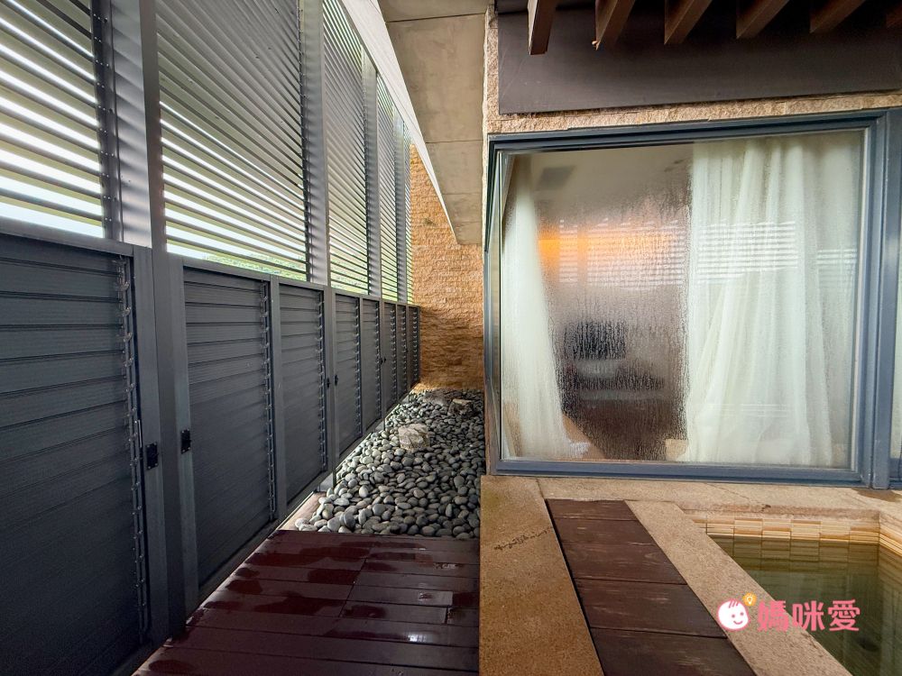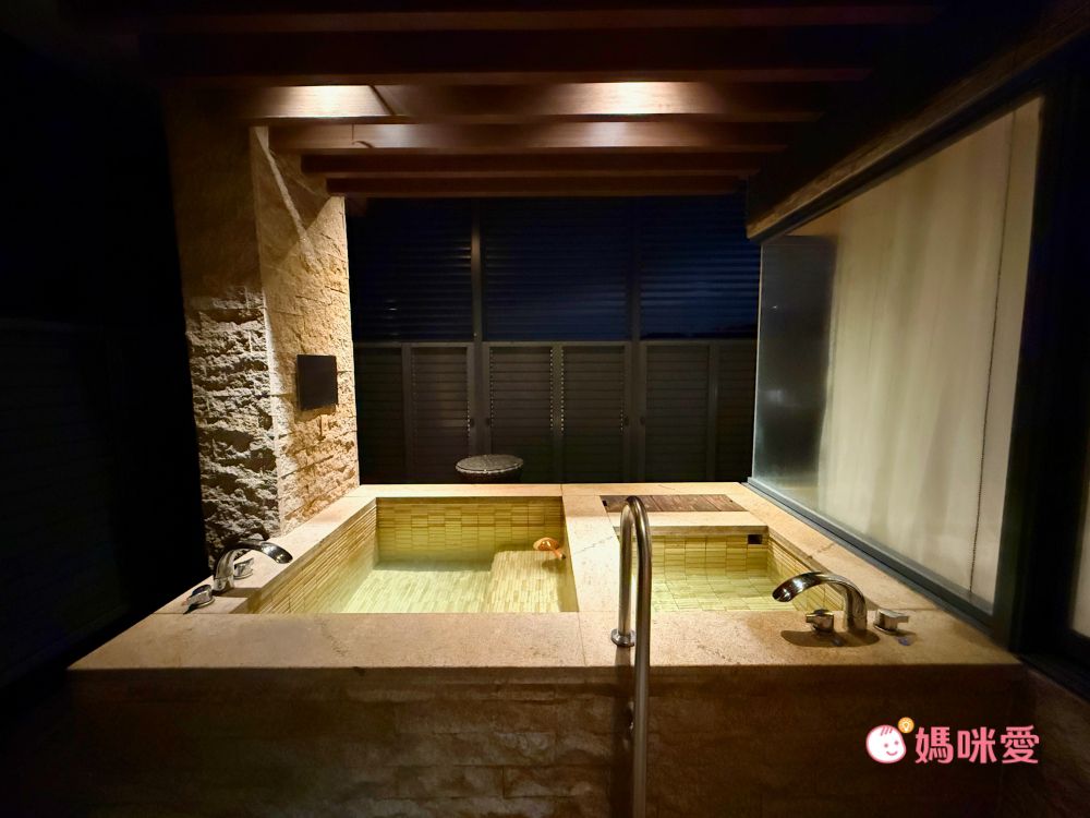 接著是客房的超大特色!!半室外的專屬溫泉池!!有不輸給裸湯屋的質感和享受,由於有圍牆和百葉窗遮蔽,可以安心泡湯,又能隱約看到戶外的風景。泡湯區就在沙發的玻璃窗後方,家長也可以坐在沙發區休息並隨時盯著孩子,非常貼心地設計~