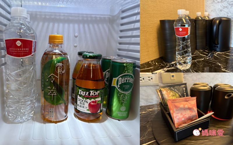 另外,房內有提供免費的寶特瓶礦泉水、咖啡包與茶包,冰箱內也提供了多樣飲品,冷翠茶、樹頂蘋果汁、沛綠雅氣泡水等,都可以暢飲。在房間泡完湯後,選自己愛喝的飲品大口喝下,真的是太舒服了~