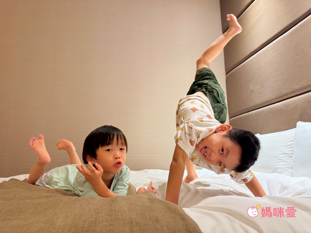 此房型提供了兩張Queen Size的大床,對喜歡在床上翻滾的霂、晳來說根本就是天堂!在寬大的客廳跑一跑後,馬上就能在床上滾來滾去,雖然床非常的大,但…還是滾下床了!!