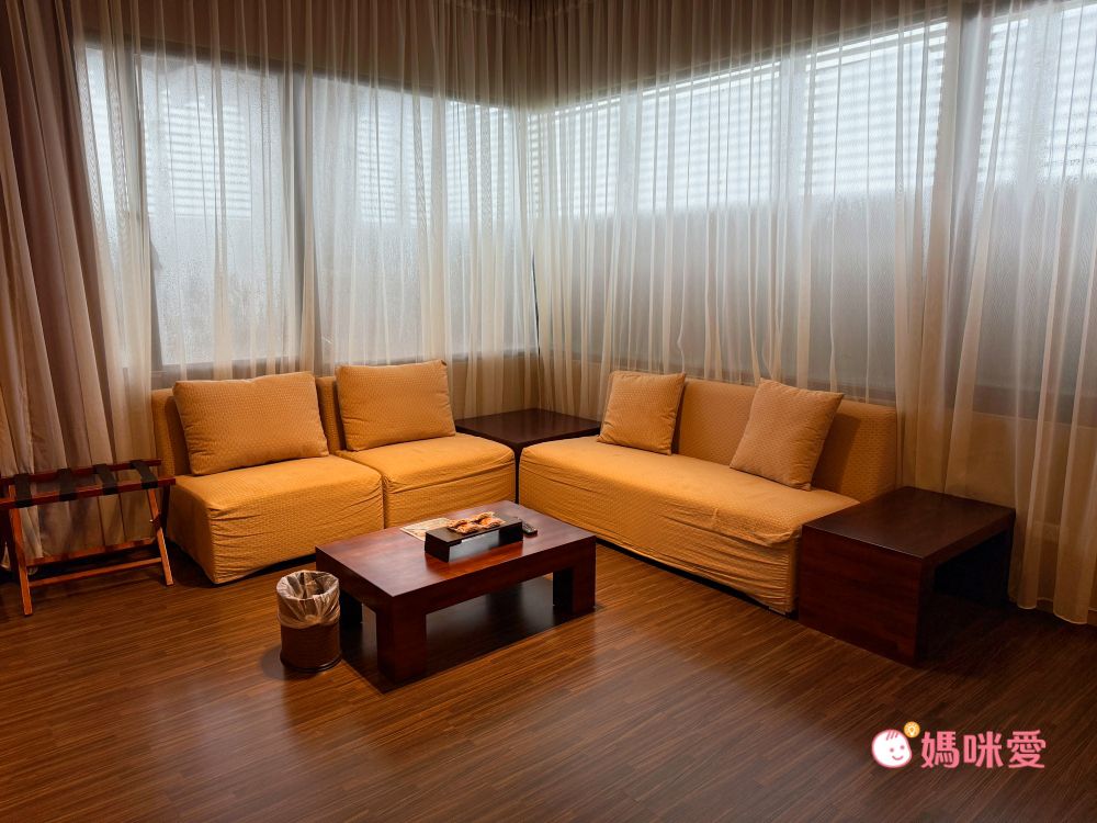 御品客房內有一個大客廳,有完整的沙發區和茶几,全家一起看電視聊天、或是和朋友一起聚會、玩遊戲都很適合,也是用餐的好空間。