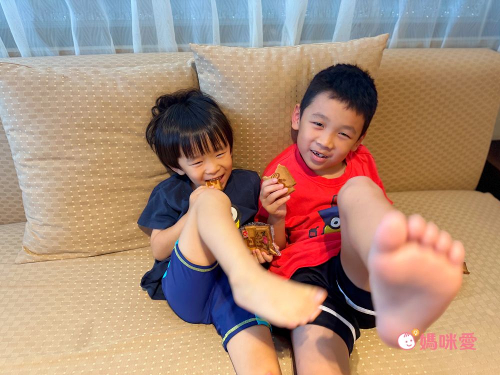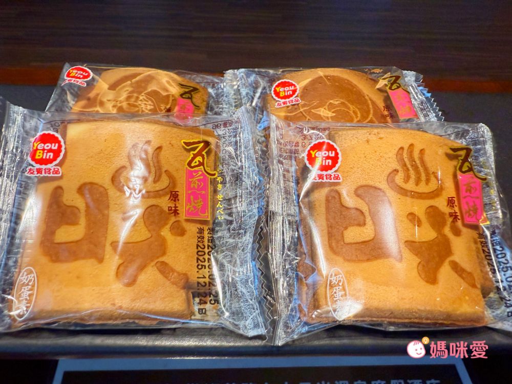 桌上有贈送日光溫泉會館自家包裝的瓦片煎燒餅乾,雖然對小孩來說比較硬,咬的時候表情都很猙獰,不過因為霂、晳覺得很好吃,瓦片餅乾入住那天晚上就全部進到五臟廟了。