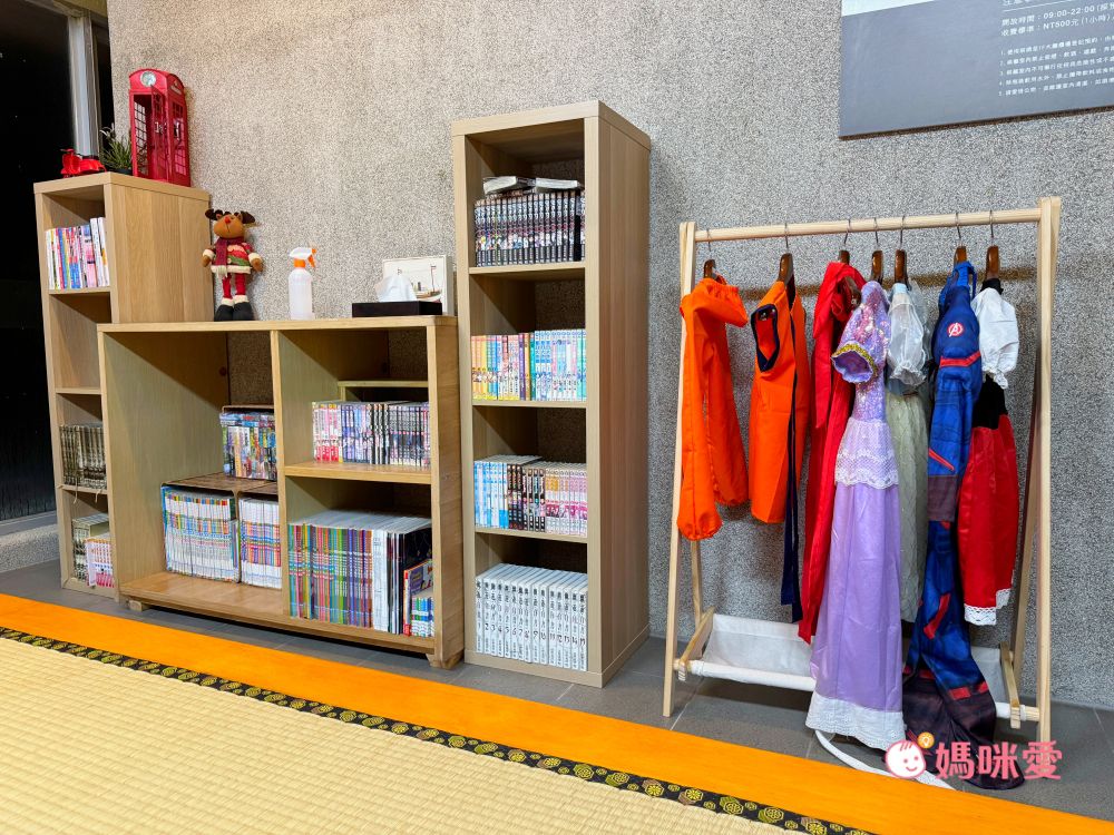 另一側是扮裝區及閱讀區,可以穿上童話世界的衣服進行角色扮演,也能舒適地在榻榻米上看漫畫